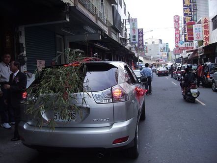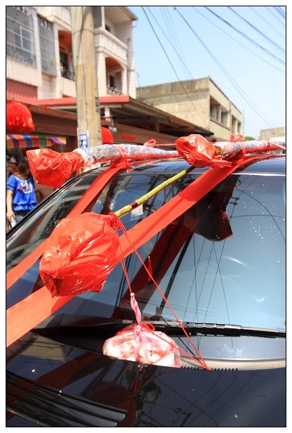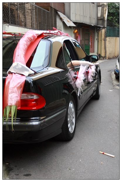 用夫家自己的賓士車,特別帶著紅色的布巾包竹子