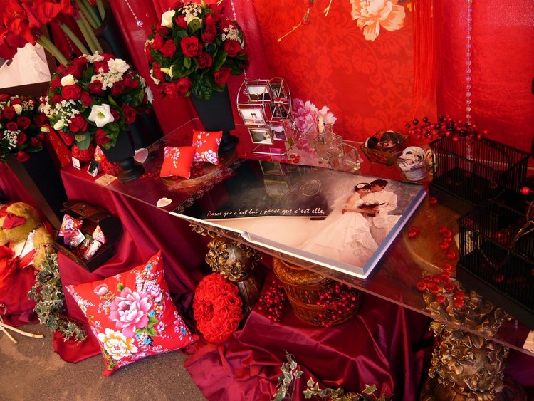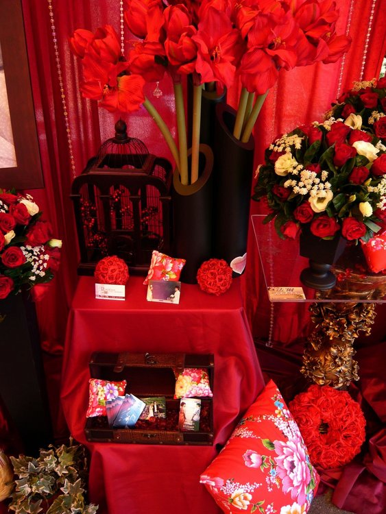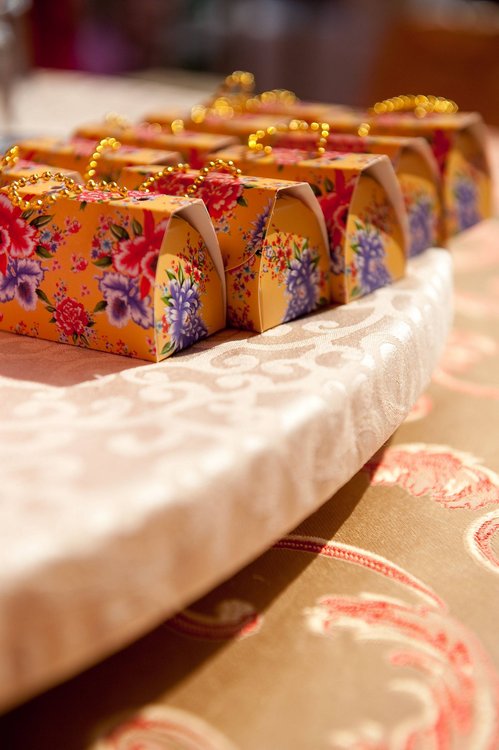 *上圖的喜幛和花籃好像是當地民代送的.... ↑小姑正忙著擺放桌卡和我買的牡丹喜糖盒↑