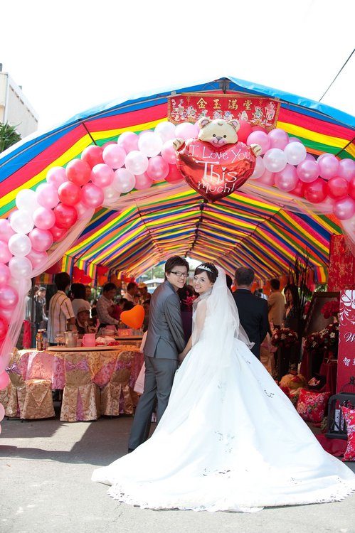 *神明廳門口也是老公自己搭架的小舞台,後頭有堂兄弟們幫忙灌的氣球,舞台兩側是我跟老公婚紗掛圖。