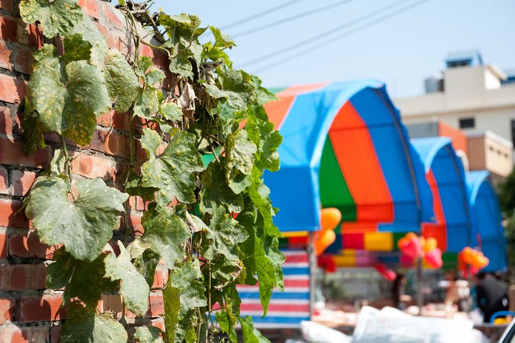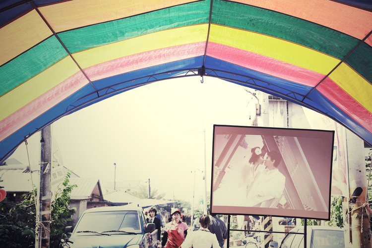 *辦桌一定會有的色彩鮮豔的帆布棚,老公請了投影機三面,方便轉播MV和即時宴客畫面。