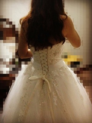 我身高160體重50三圍32、27、38,身材屬於有胸部但是小腹屁股大較胖,都挑比較修飾下半身的款式,兩件婚紗都是後綁帶,所以一般穿M都可以穿