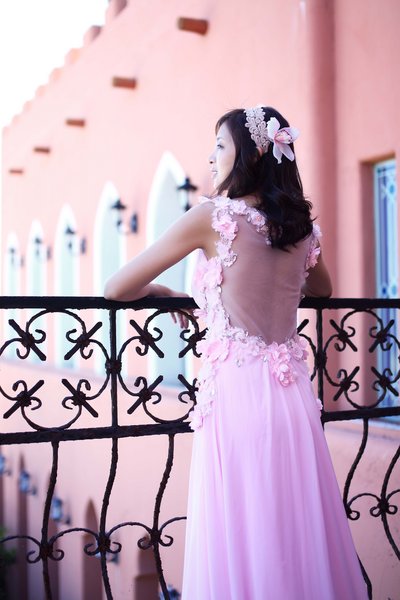 粉色禮服穿起來很有氣質,且帶一點小拖尾