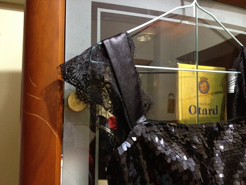 上半身是黑色亮片+蕾絲肩帶