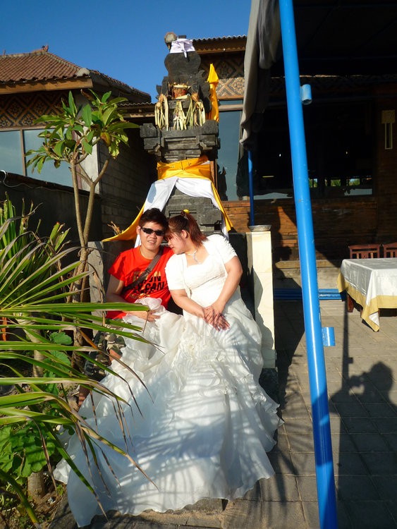 結果,我一時拖口而出,說了:"A,妳當我的伴娘好不好?"(心裡想說找兩對好了,原本的1號跟我妹,然後A跟我堂妹.然後想說反正教會婚禮的伴娘穿的是簡單的白紗,這樣她公證也可以穿呀,我來去買一件送給她)結果,剛剛才說自己不想穿,我問完以後,朋友A就紅著眼框跟我說:"ㄟ,那這樣我是不是就可以穿到禮服了呀" 草:"對呀,我們在教會結婚的禮服也是長的白色的喔,只是沒有澎澎" A:"蛤~好好喔!我以為我一輩子都不可能穿到了耶,那我一定要快點剪肥"