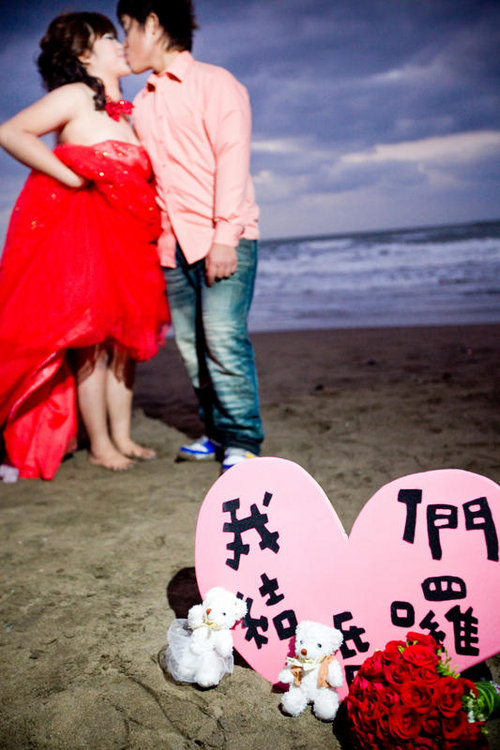 自己做的木頭字版和剪字、婚紗店提共的花束、小熊結婚偶