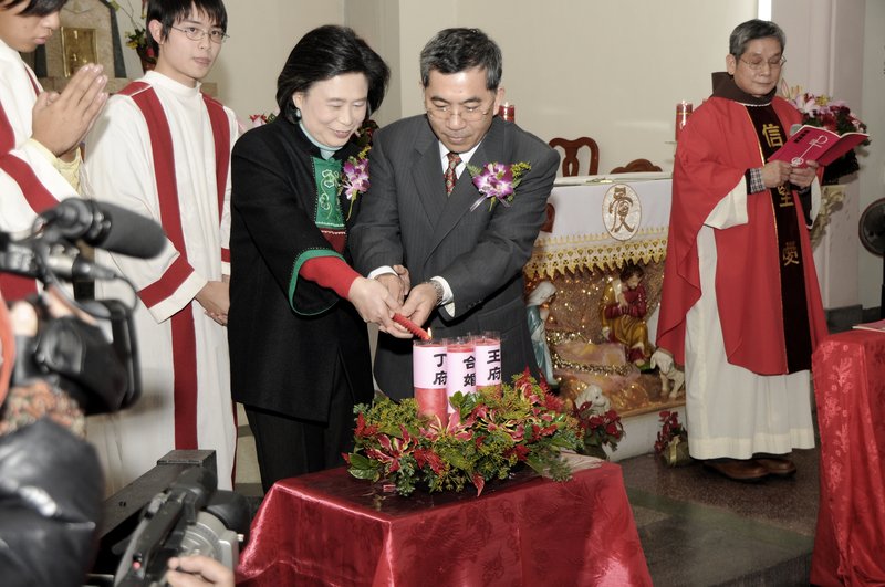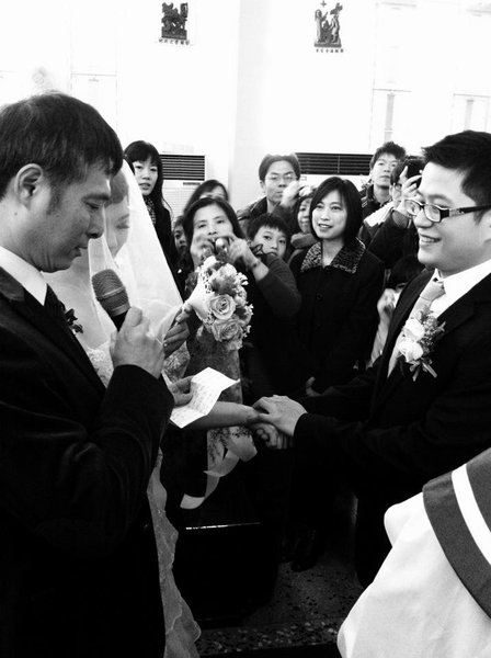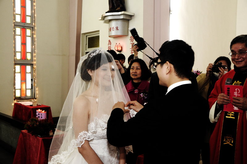 我給妳(你)戴上這枚戒子,表示 我對妳(你)的忠貞與愛情。因父及子及 聖神之名。