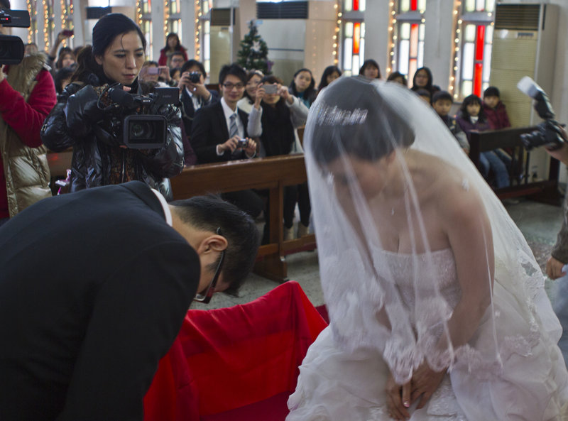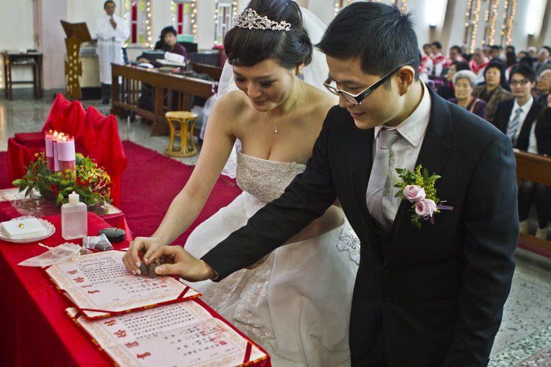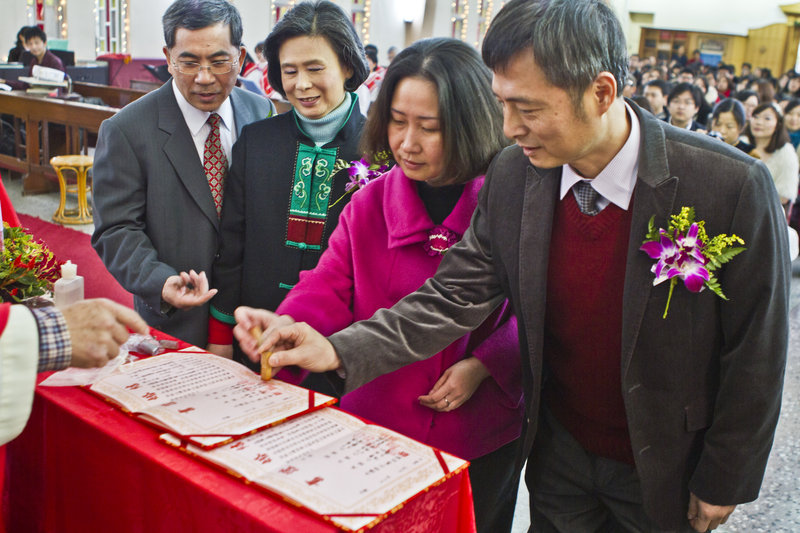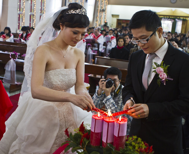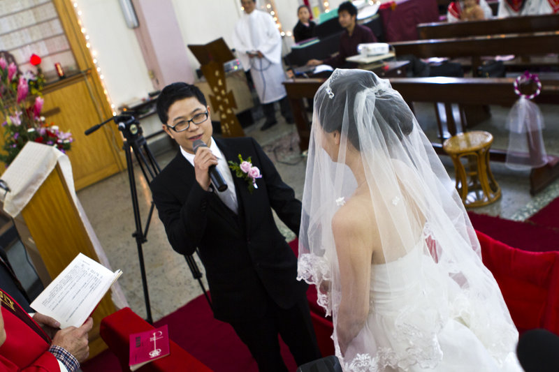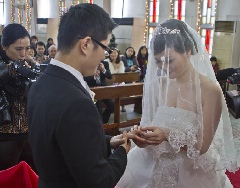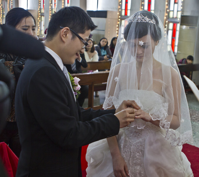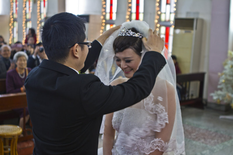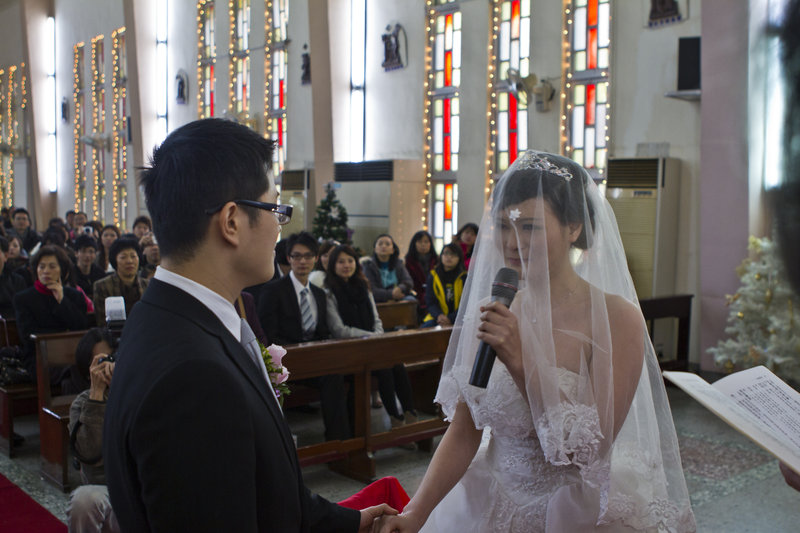 我丁大哥,願遵照教會的規定,接受你王小妹作為我合法的妻子,從今以後,環境無論是好是壞,是富貴是貧賤,是健康是疾病,是成功是失敗,我要支持你,愛護你,與你同甘共苦,攜手共建美滿家庭,一直到我離世的那天,我現在向天主宣誓,向你保證,我要始終對你忠實。