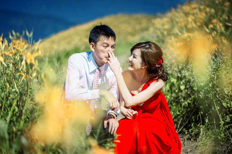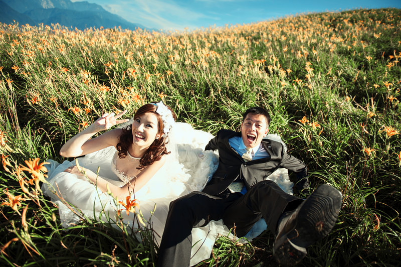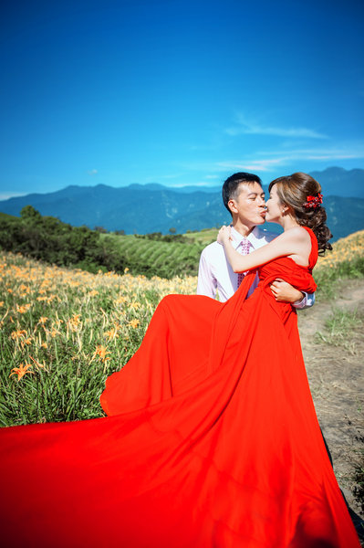 關於地點由於想去我和男友交往初期曾經去的宜蘭和花蓮六十石山 (超遠的,都快到台東了) 因此一開始我就列了初步行程給他,小二也非常熱心 & 開心的跟我討論,後來雖然因為颱風延期過一次,但幸好我們還是在九月初成行且順利拍到我好想要的金針花!!! (而且還有好藍的天空,轉圈圈~) 原本有想約出來討論,不過我們住在不同縣市,最後還是主要以email討論,也有告訴他我想拍哪些感覺,大致上都有拍到,雖然也有一些遺珠之憾,不過我覺得因為整體好看的照片太多了,所以也沒關係啦 XD 要是有機會拍周年紀念再說,哈哈~(還有助理小八非常辛苦,扛著很重的相機 & 燈還要一直幫我調裙襬,在此一起感謝!)