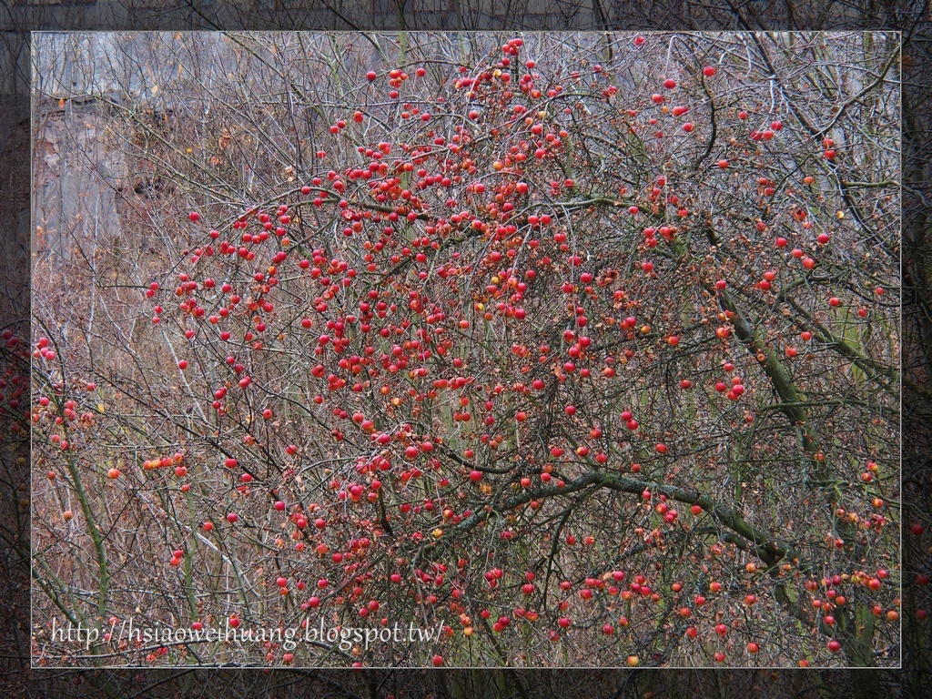 蘋果樹也不怕冷,葉子都掉光光了,還有一堆紅通通的蘋果兒在樹上。