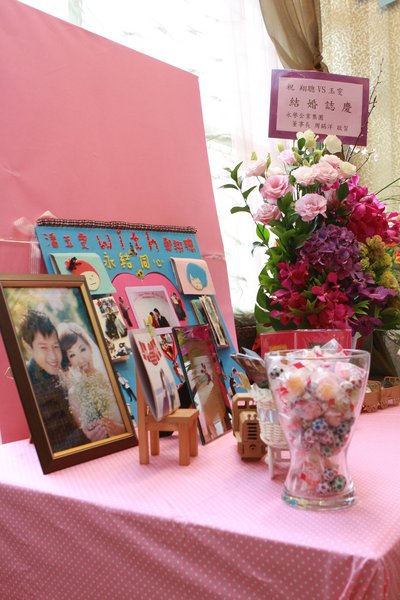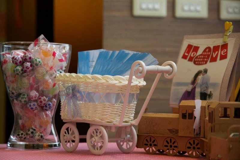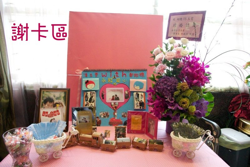 謝卡區:粉色點點布(永樂市場批貨)、紙火車(員林糖廠買的)、嬰兒籃(輔大某間商店)、小木椅(帥帥買的)、DIY藍色背板照片(小妹手工DIY製作)、粉色背板(朋友想的,用保麗龍及紙 DIY製作)、木夾、相片、相框、花(公司送的盆花)、花瓶(IKEA買的)、糖果及巧克力(給賓客吃及佈置用)