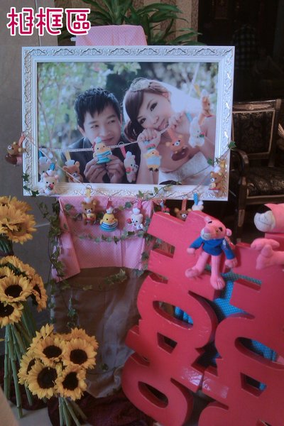 相框區:向日葵、7-11熊(自己串起來)、長春藤、囍字(帥帥手作)、頑皮豹、粉色點點布、藍色點點布甜點區:杯子蛋糕、棒棒巧克力餅乾、草莓塔、蛋糕架(朋友提供)、蛋糕架底盤花(帥帥插的唷)