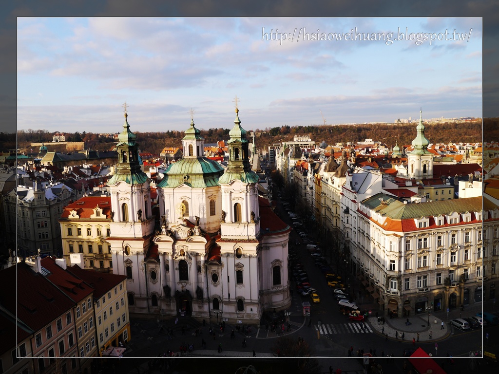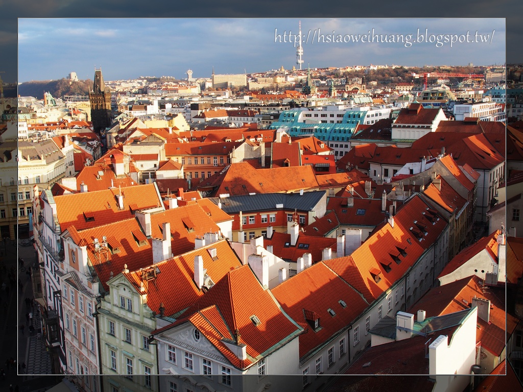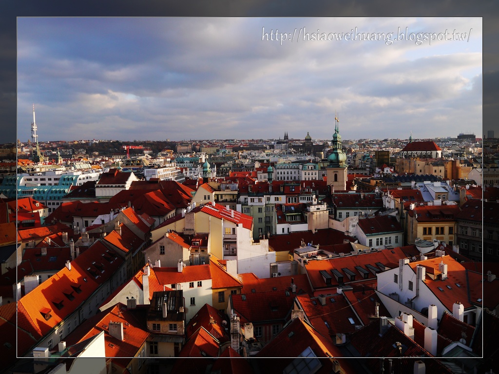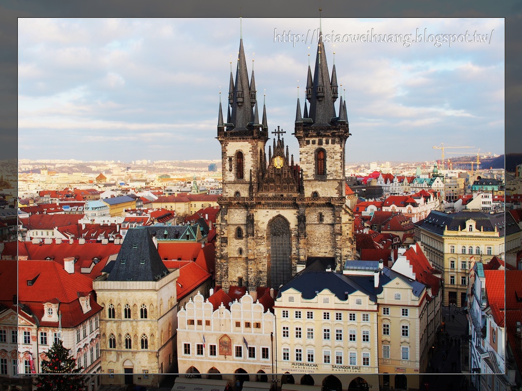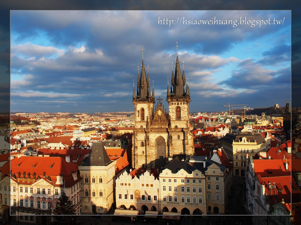 圖為由布拉格天文鐘頂往東面眺望的景色,對面高聳的建築即是提恩教堂!