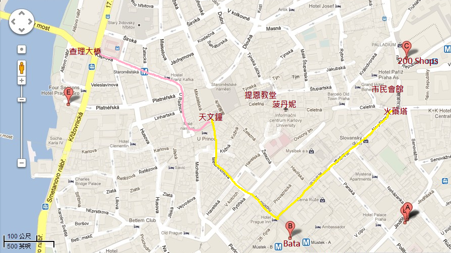 我們先沿著黃色的路線,由火藥塔沿著護城河街往天文鐘的方向走,