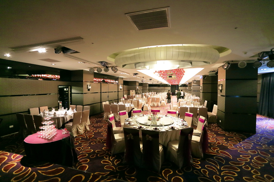 - 第一眼對水源會館的印象就覺得是很氣派的夜店(噗),其實水源會館是走紫色的低調華麗風,整間會館都圍繞著紫色及紅色。總共有四個廳,都是以花來命名:海芋、玫瑰、牡丹、百合。