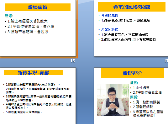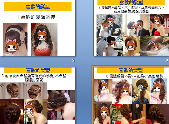 距離婚期三個禮拜前,和Yumi約了試妝及討論妝髮!也準備了一份PPT給她,裡面包含婚紗照,喜歡的造型的照片 (從阿K學姐那裡學來的^^”)