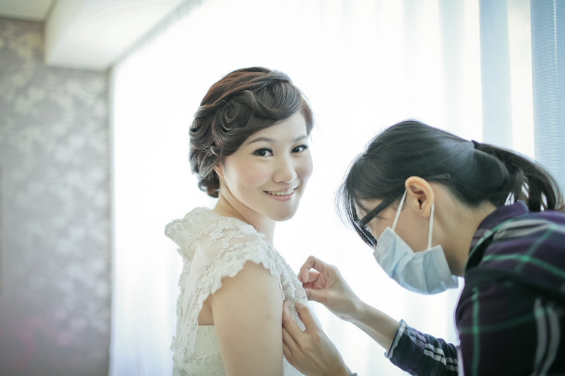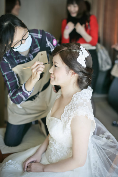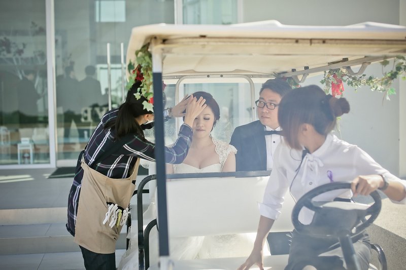 最讓我感動的地方是,她不像有的新秘弄完造型就留在新娘休息室等新娘回來,相反地,在我的訂婚宴客過程中,她都會在旁觀察我的妝容,適時地上前整理,並且時時提醒我要微笑,不要緊張,免得拍起照不好看,由下面這張照片就可以知道她對造型的完美度有多堅持,就連發車前一刻也不放過!^^