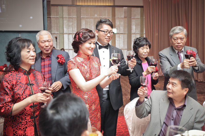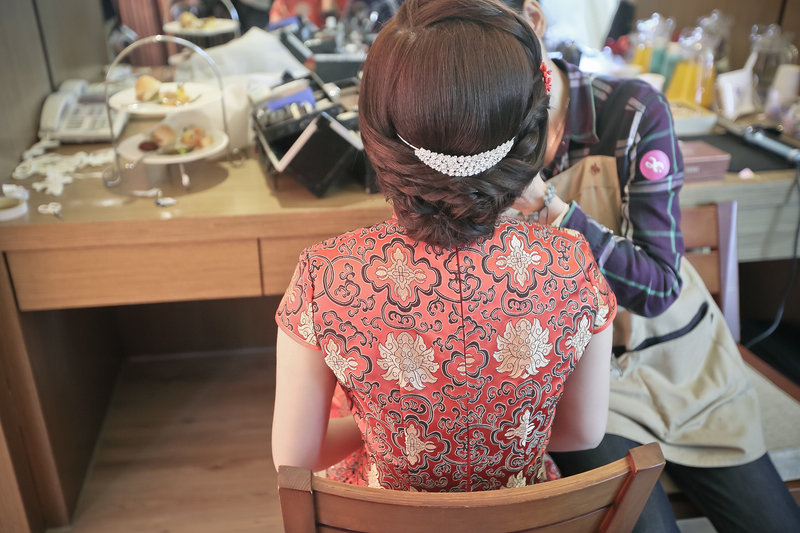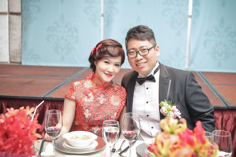 第二套:大紅旗袍,我是將旗袍放在敬酒時穿,因為比較方便行走。當初跟新秘預定的方案是只有兩套造型,所以換穿旗袍時就沒有更換髮型,但專業又貼心的新秘仍是主動替我更換頭飾、戴新娘花及變換口紅顏色,就像換了另一個造型,沒想到白紗髮型搭配旗袍一樣適合!