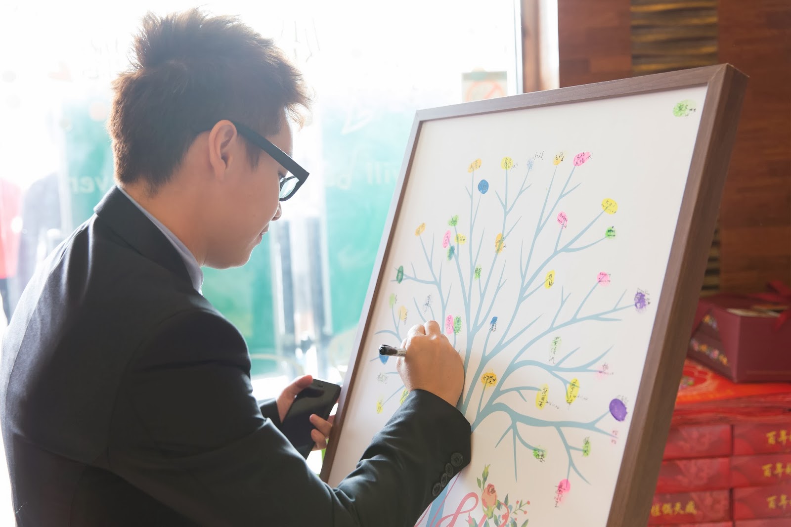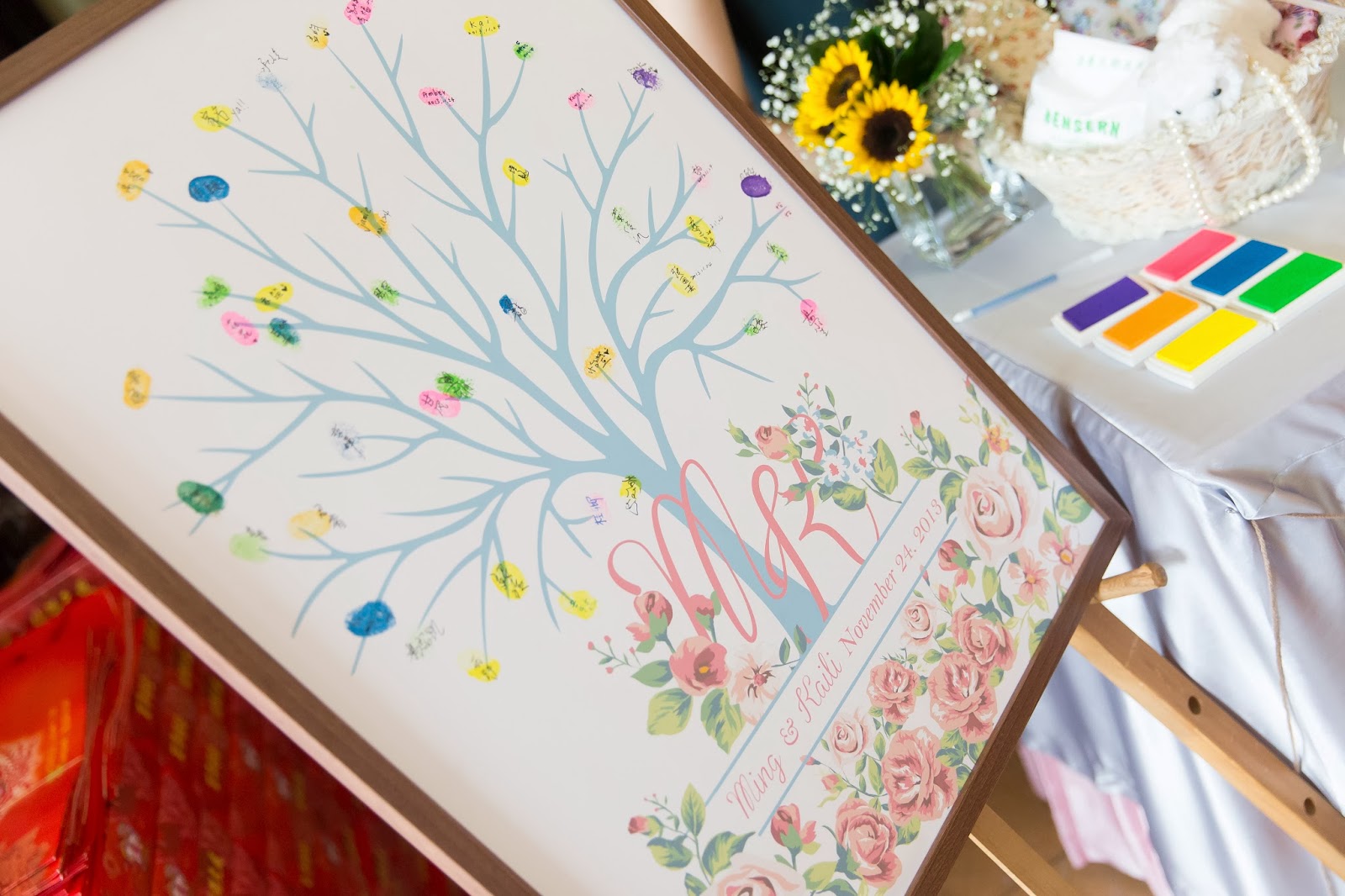 讓賓客蓋手印簽名,取代簽名軸,一樣是用畫框裱起來,未來可以掛在家哩,