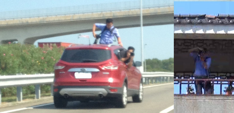 好不容易,在前往老公家的途中,我心想他們可以休息一下囉~沒想到Joe讓迎娶車上的大家都傻眼了,有如特技團隊一般繼續記錄著前往婚禮的禮車,還遇上了天橋外加地下道,當下我懂為什麼Joe的褲子老是要爆破了。
