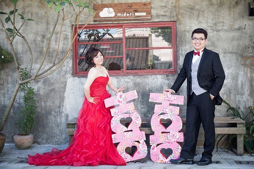 門市人員"買樂"立馬幫我換天拍照,不斷幫我協調拍照時間及禮服,後來攝影師改成了LYNN,直到跟LYNN溝通完畢後我知道可以安了~~~~LYNN非常仔細的看了我的計畫書,(有的連新娘我都忘了有寫),拍照當天是選舉日11月底竟然大太陽(拍照路線:四四南村、河濱公園、實踐大學、室內景),好熱壓~造型師VICKY不斷幫我們擦汗,而且超會把握時間換造型,連買便當的時間都不放過馬上幫我換了一個造型,燈光小生不斷指導我們動作,還細心的幫忙黃董裝上隱形眼鏡,從來沒帶過隱形眼鏡的黃董,在試戴時都哇哇叫,只有小生竟然成功了。知道黃董最愛吃滷肉飯,小生不斷叫著滷肉飯讓黃董展開笑容,拍照過程中好有趣,現在拍完了竟然覺得有點空虛~(當天為了不要讓黃董太累,還請買樂幫忙安排車子,品質有保證)。現在分享的只是毛片,還沒精修,我爸媽和公婆都很滿意耶!!另外我們有自己做了客家版的囍字今年五月宴客完畢打算售出,如有興趣可先留言喔~