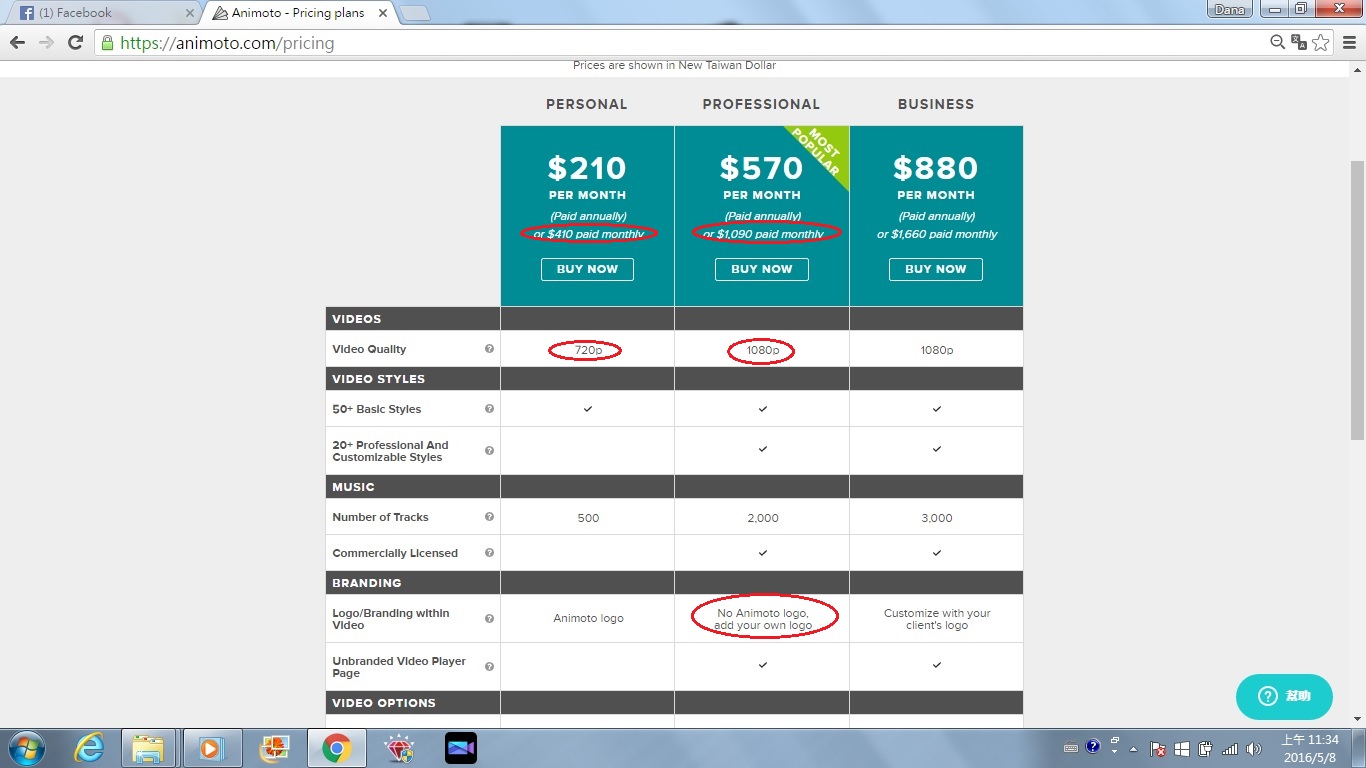 附費的等級如下(我買professional~除了高畫質下載還可以將Animoto logo 改成自己的logo)