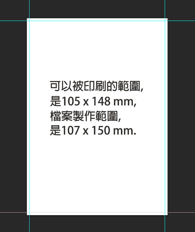 107 x 150mm的檔案大小,設置2mm的出血範圍,設置共4條參考線。