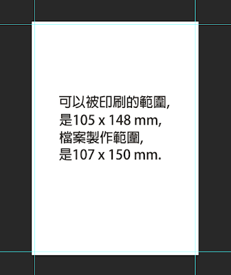 假設最後的成品大小尺寸為105 x 148 mm (一般標準明信片的尺寸),在製訂圖檔大小尺寸的時候,要在長寬增加1-3mm (根據各印刷廠商的規定) 的「出血」。