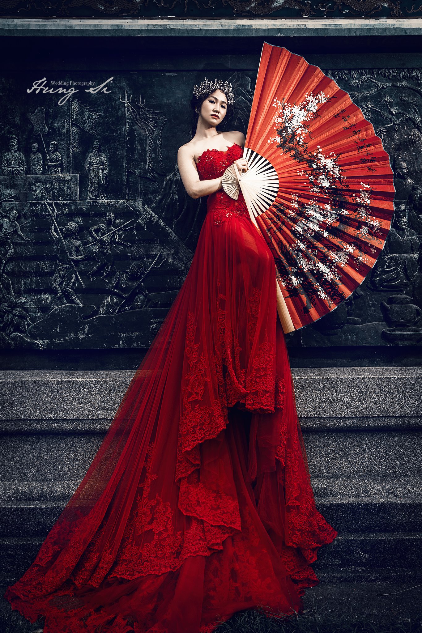 第一個是孔廟,在這個充滿中國風對古蹟中,我們選擇了搭配紅色的大A禮服,一開始洪寺老師選擇了大門當背景,並且細心的指導每一個動作及表情,但我那個沒救了的老公,總是擺出一付笑起來跟沒笑一樣的表情,害我超擔心洪寺老師會生氣,沒想到洪寺老師在酷酷的外表下其實是個充滿耐心的暖男,雖然笨老公還是只拍了一系列無表情的臭臉照片,但對於自己的中國個性風系列真的是超滿意的說。