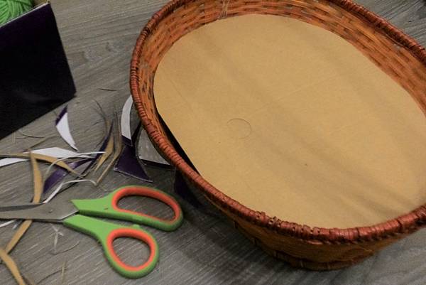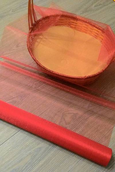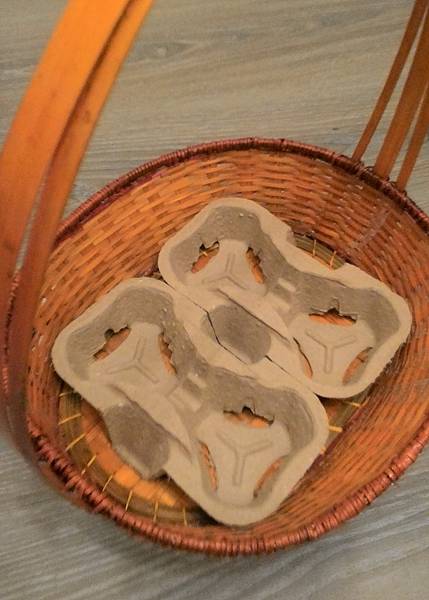 都做好之後,要來裝飾籃子了,拿訂婚時裝 12 禮的籐籃來改造,籃子比較深,用 7-11 的咖啡杯座墊高一點: