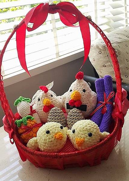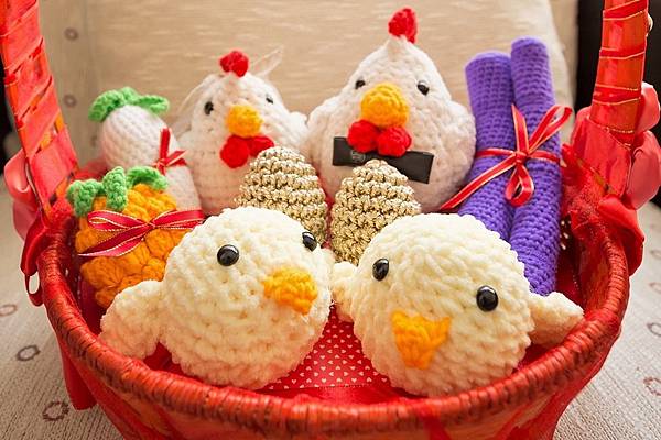 現在大多以裝飾品代替了,嫁妝店或婚禮用品店可以買到一整組,有的還有雞鳴裝置會咕咕叫,比較傳統的雞追求擬真,看起來像一對雞毛撢子~ 現代的 Q 版又不是我喜歡的樣子,於是只好自己來了!