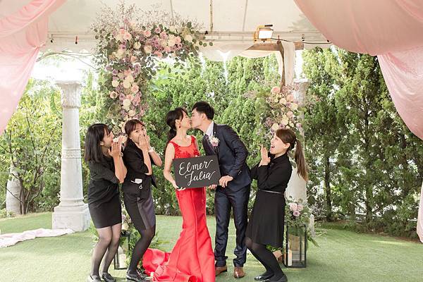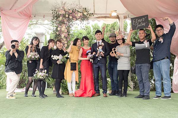 另外,關於要在哪裡送客拍照?我們一點都不想要浪費這麼美的戶外自然光,小帆說下午3點左右太陽不會直射證婚的草地方向,我們就只好賭11月的時候新郎不會拍照拍到中暑,決定在戶外送客,還可以省去許多婚禮常見的塑膠背板,環保愛地球,又美又省錢哈哈XD 而且假草皮超棒!不會有蟲蟲的問題,就算有朋友穿高跟鞋(雖然我沒有穿啦哈哈)也不會陷進泥土,拍照還是一樣藍天綠地很美的~