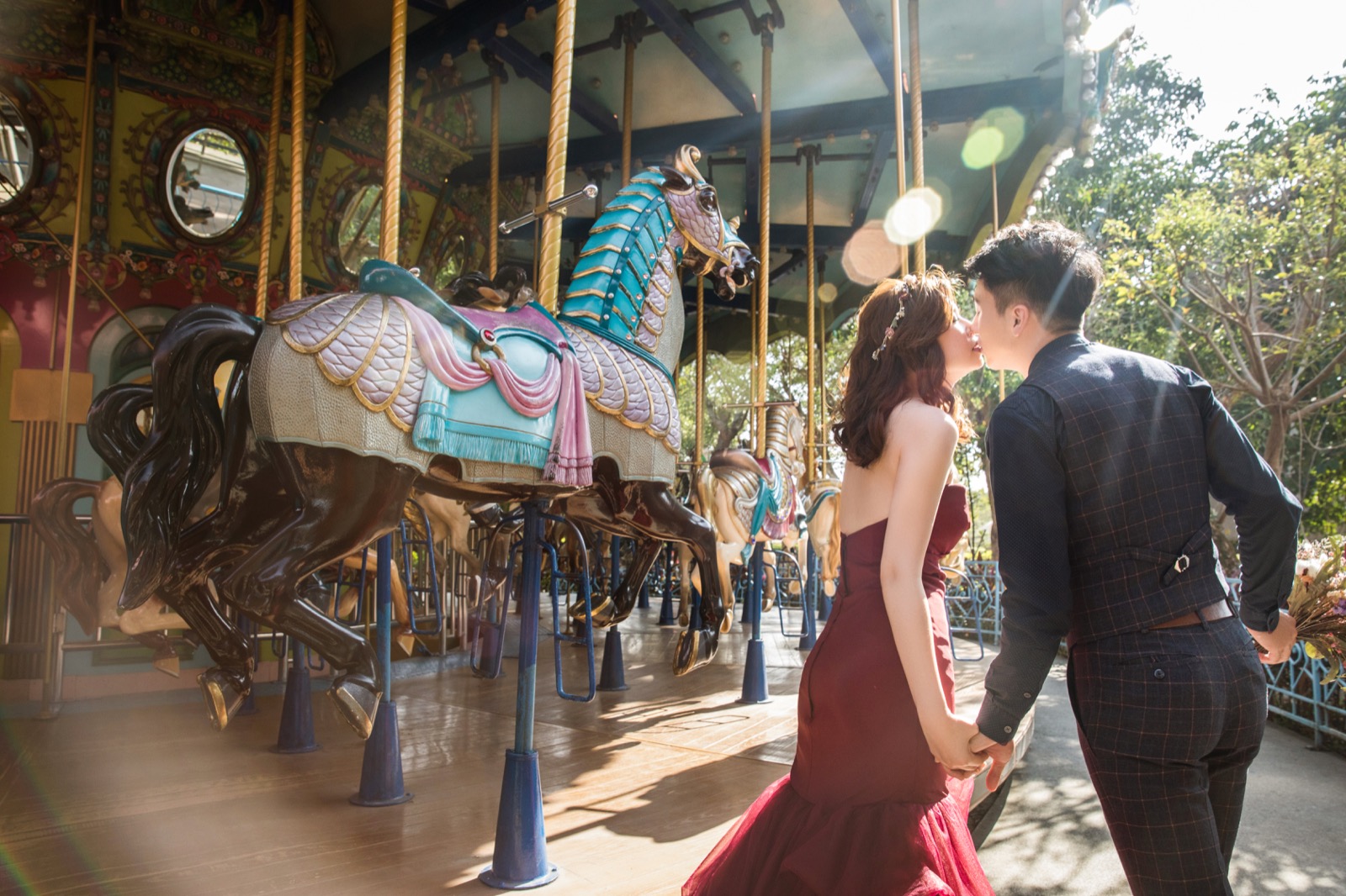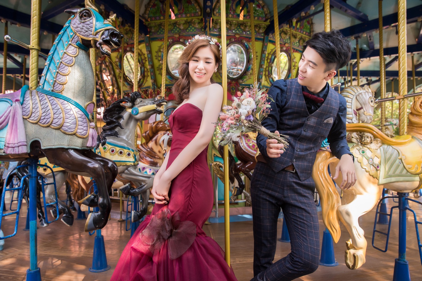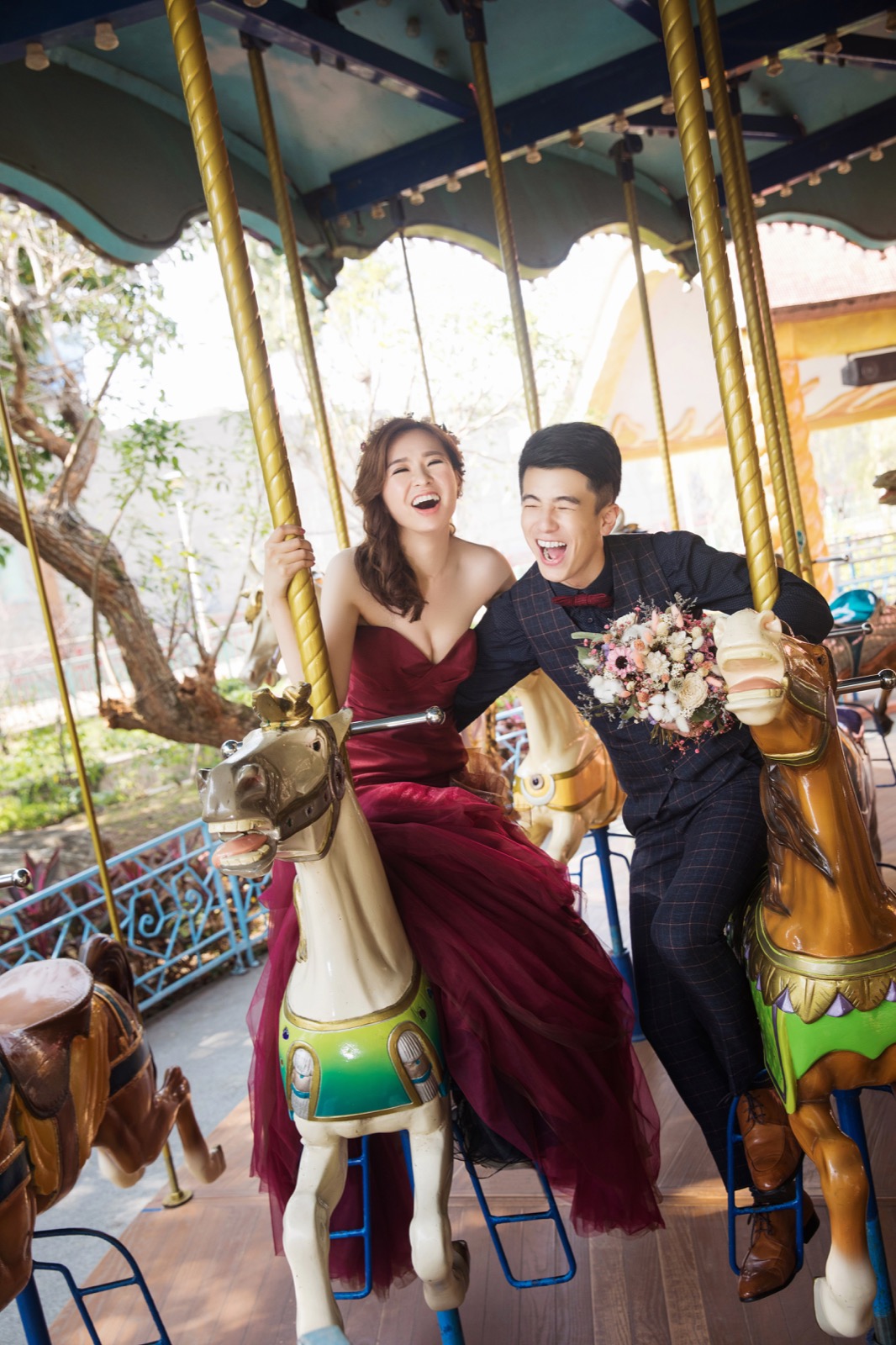 和老公討論時,想到既然選擇了旋木那就來拍旋轉木馬吧!於是我們找到了麗寶樂園(原月眉)。順便介紹一下,麗寶樂園是可以申請拍照的,門票還能打折唷!記得一個人是300還是多少有點忘了,但有限制五個人(新人x2、攝影、彩妝、助理)。
