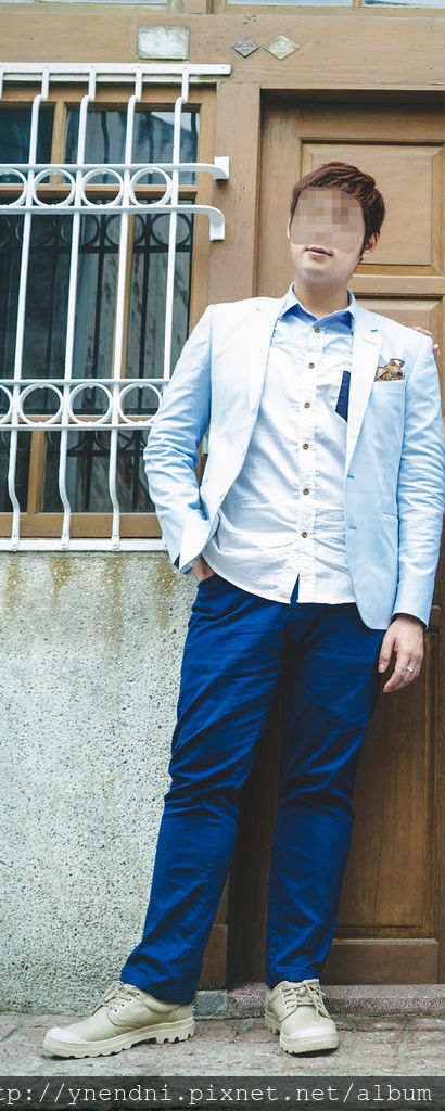 因為銀桑的腿練的粗壯,東潮褲子對他來說滿緊繃的,所以拍照是穿他自己的藍色褲子