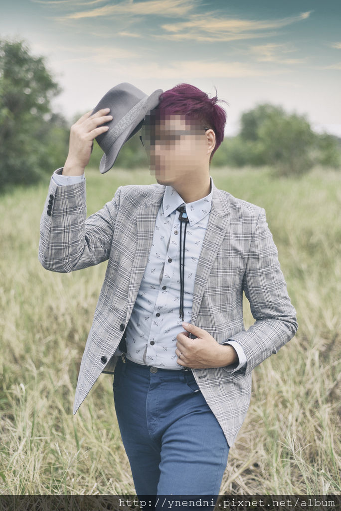 像是俏皮、有玩心的紳士,這套我們在大草原拍攝,灰色外套配綠色背景頗好看的