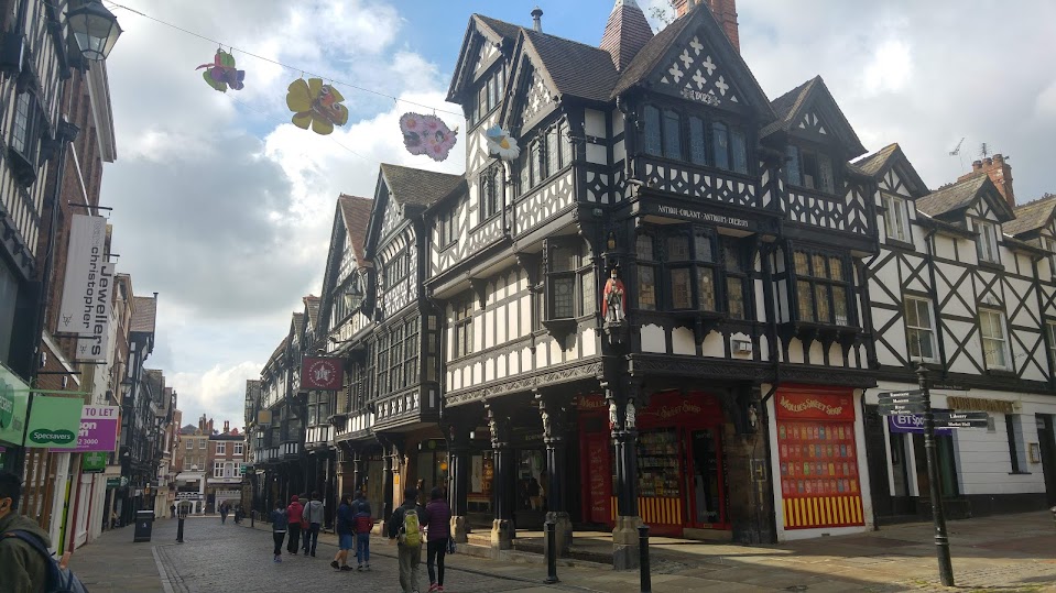 <黑白相間的木造排屋都鐸式建築是契斯特的特色>
