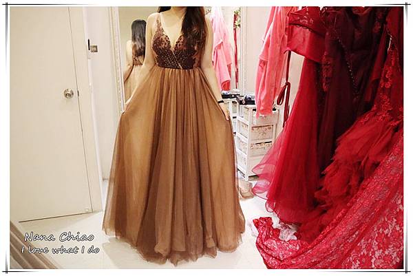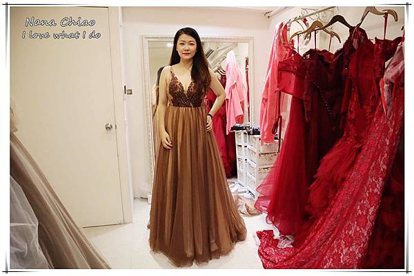 這件咖啡色婚紗的剪裁跟黑粉款類似,但款式比較典雅,適合的拍照風格也不一樣