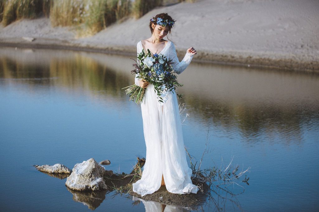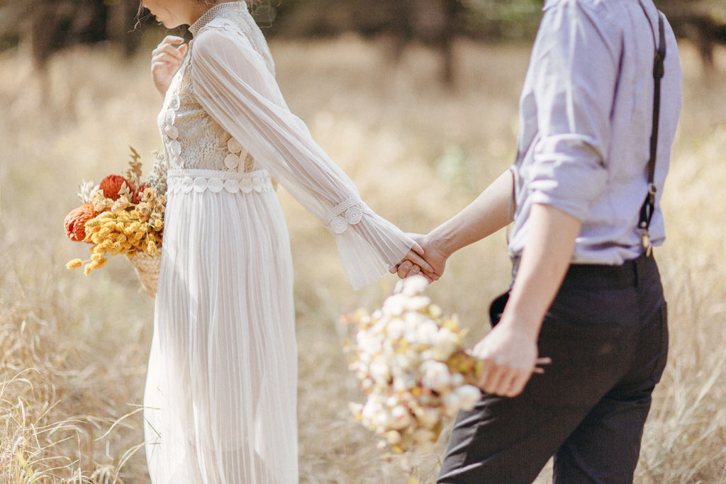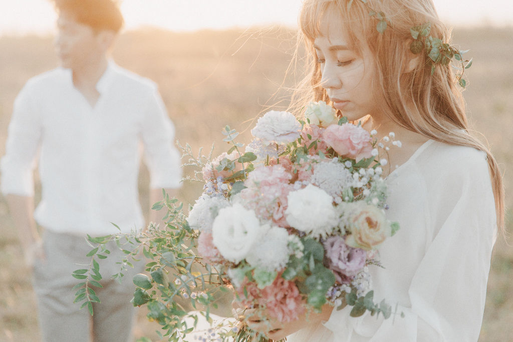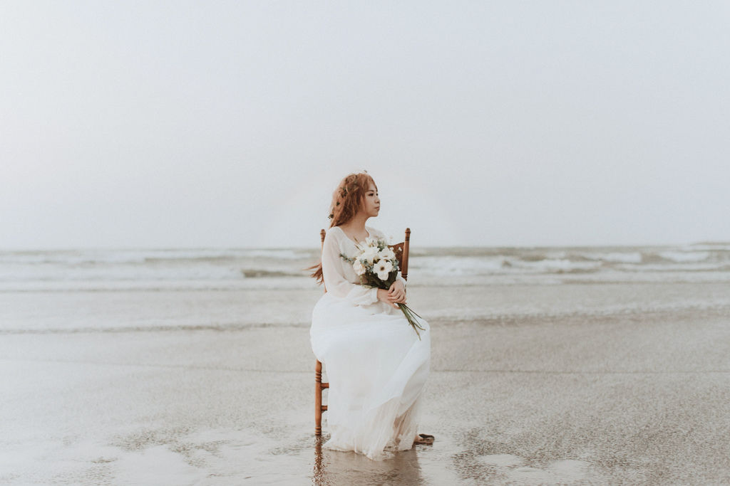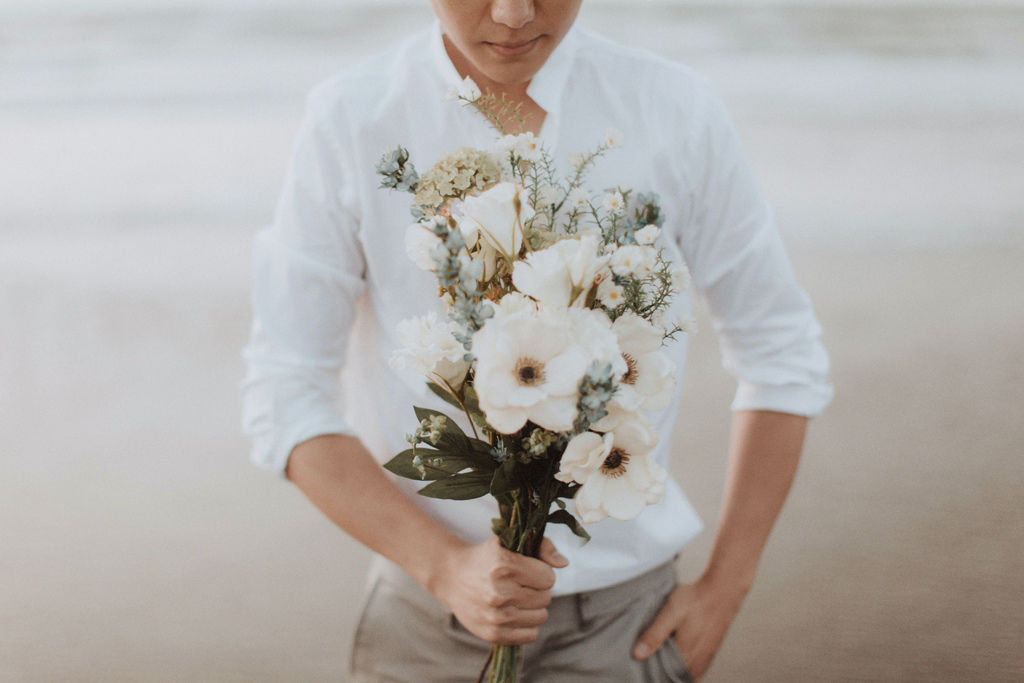 海邊穿著美式婚紗,所以Zoe準備了清新的白色系花束
