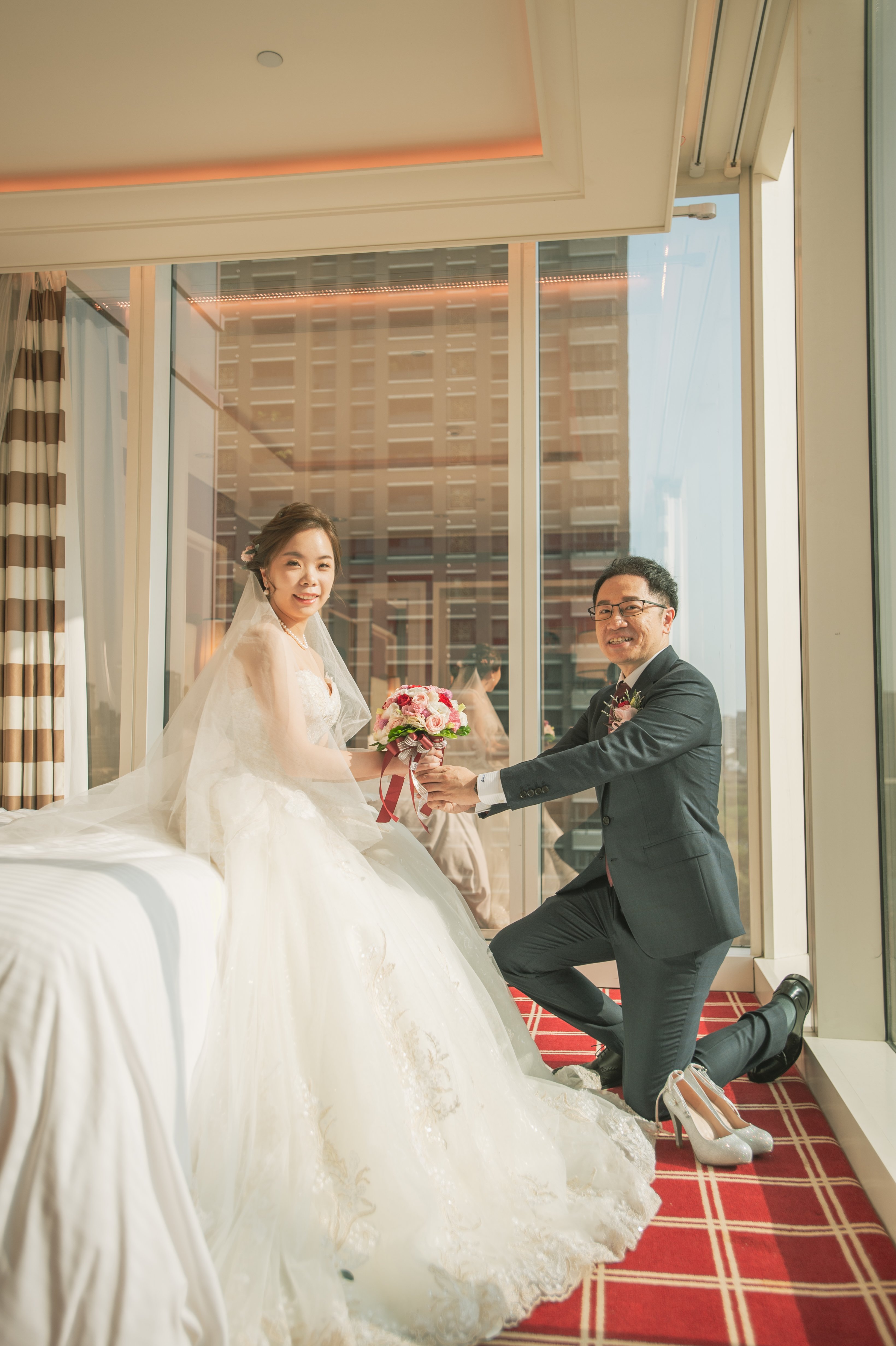 結婚當天,克里夫&亞倫大師從早5點多陪我們到下午3點多,攝影時會注意很多小細節(例如雙方在拍攝時會躲開彼此的相機;為了角度甚至躺在地上…等),也會帶動氣氛,不讓現場飄出尷尬的冷空氣!雙人雙機的好處就是可以同時補捉不同角度的景色畫面,而且彼此默契又好,這才是最重要的!