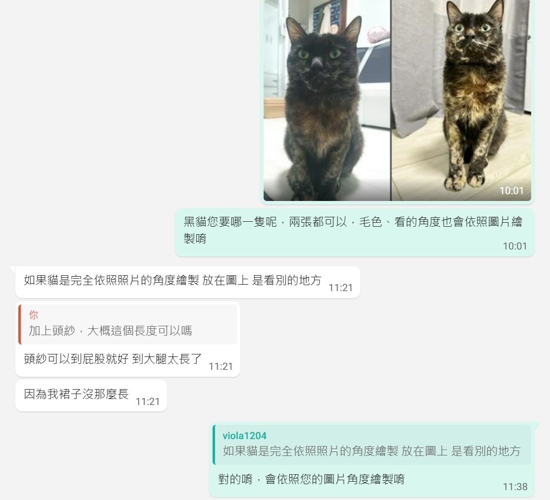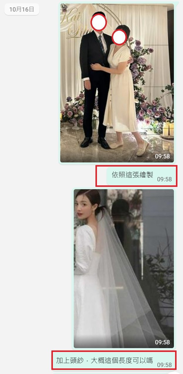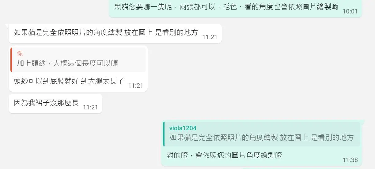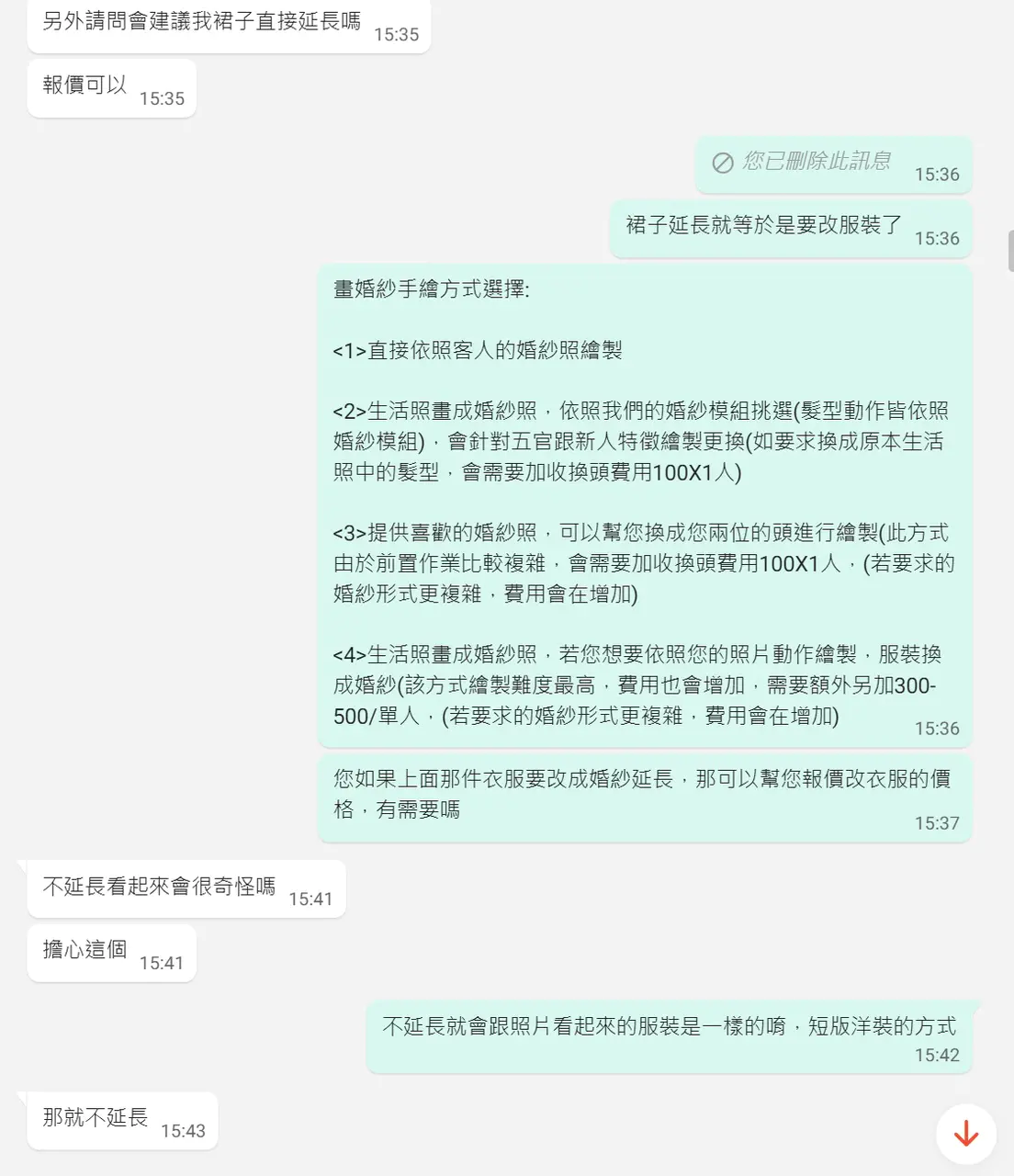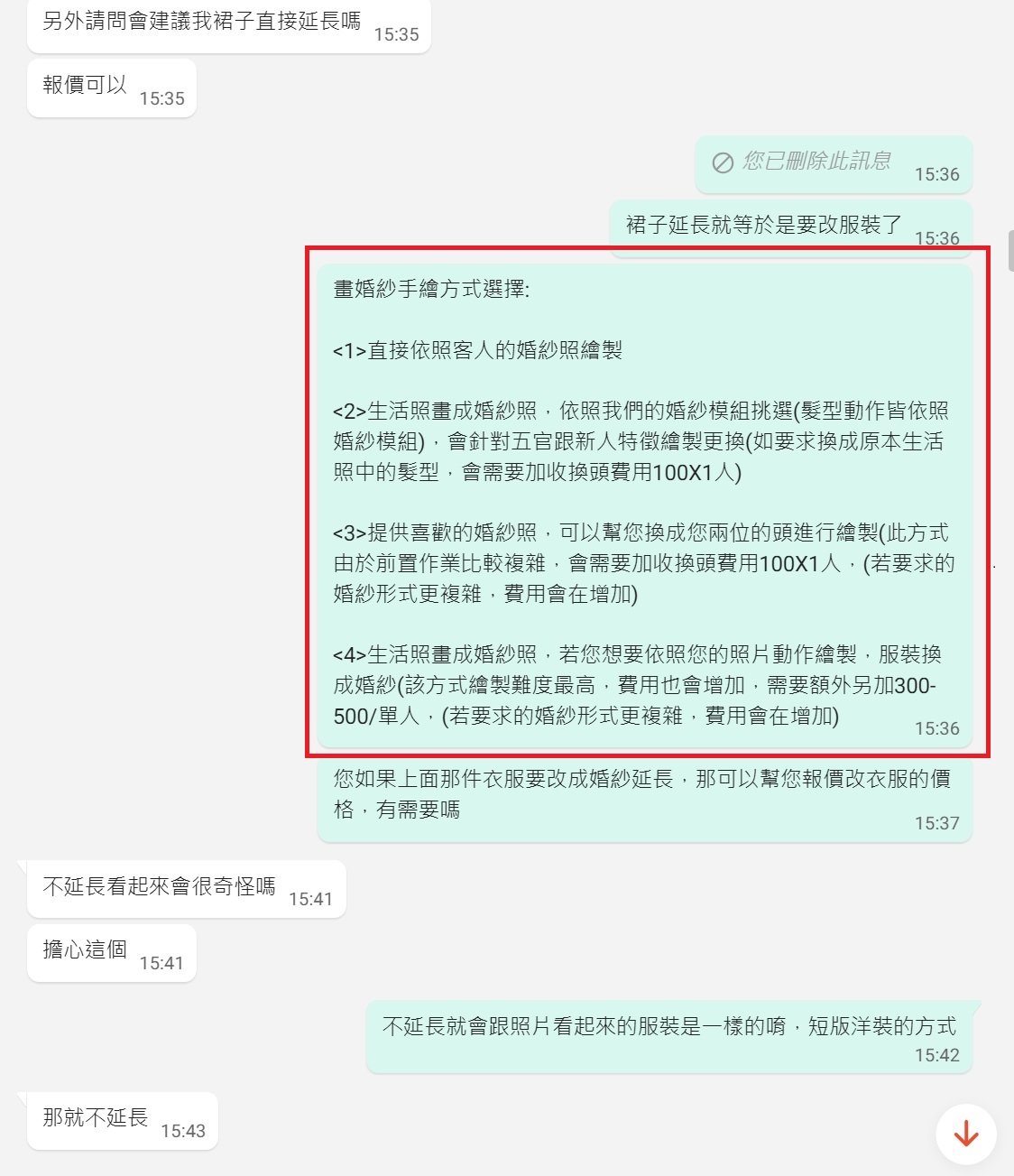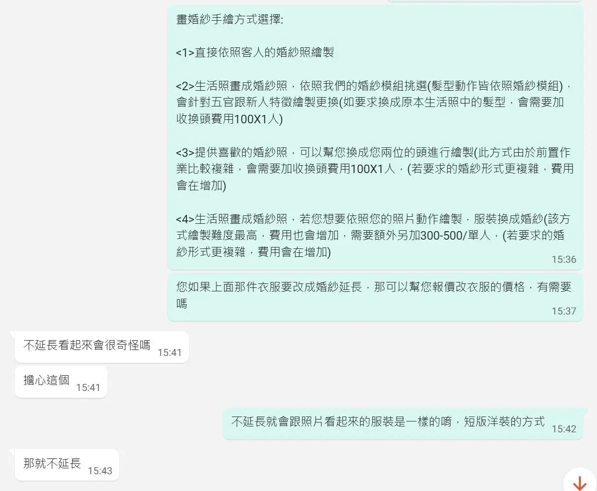 圖 D-1, D-2 我提供的照片是到小腿肚的長洋裝,但是我不是穿高跟鞋,我很難想像繪製起來整體效果會是怎麼樣,所以想尋求建議,這樣畫面會不會很奇怪呢?然後又再說模組啦,繪製要錢,我捧花跟頭紗都加錢了,我只是想聽一下建議(這裡希望他可以分享一些作品告訴我效果,讓我比較有畫面感),結果他說不延長就是跟照片的服裝看起來是一樣的唷,我真的謝謝你,聽君一席話如聽一席話,火大到不行,算了直接不延長,看效果怎麼樣。
