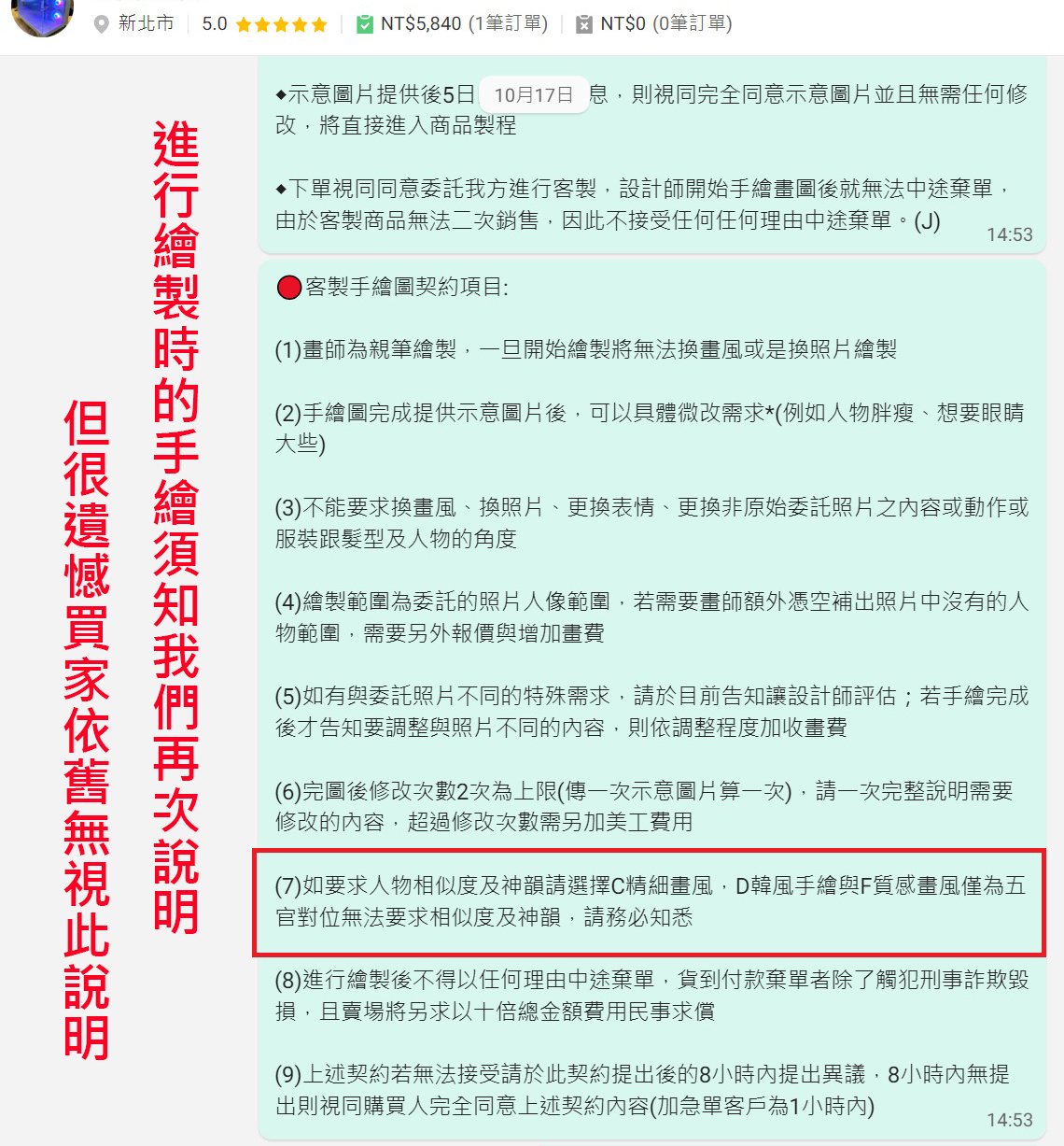 整件事下來,可以感受到賣加整個經營模式已經走向商業化,在討論客製化除非顧客自己也很有美感或是設計概念,不然這樣的溝通方式很難達到要的效果,另外費用的部分他們可能會堅持我幫你保留名額?(到底什麼名額啦)而不退,這時候我可以透過蝦皮仲裁或是民事訴訟要回沒有印刷的費用(雖然畫師畫的我不喜歡,還是尊重他們產出作品時間,費用一定是需要拿),但是結婚是開心的事,誰想沾染這些晦氣訴訟呢?但我也完全不想發一張不知道新娘是誰的謝卡給親朋好友,就認賠了,再繼續溝通修改真的意義不大,只好5840當花錢消災,也替大家除個雷。