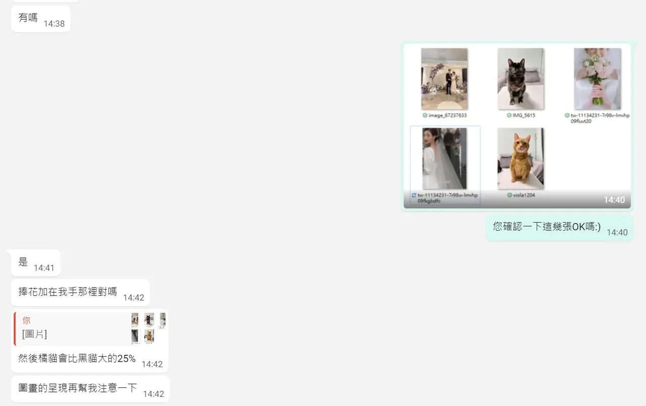 不開心的事說完了,來說點開心的吧,這個設計師非常細心,電話溝通了風格,想呈現的氛圍,溝通完就跟我要一些照片,他可以透過不同角度去思考構圖,也可以把我跟先生還有貓畫得像點(當然我先生怎麼畫怎麼像,真的有夠好笑),當天人物草圖出來,確認沒問題之後,隔天整個構圖草稿都出來了,一隻貓趴在先生肩膀上,我們一起抱另一隻貓,我們超級愛這個畫面,大家都說好看很多,圖片就不放出來了,尊重後面的設計師,最終順利處理好真的太好,結婚只有一次(應該吧,哈哈哈哈哈),大家都會希望盡量完美,這個雷我來踩了,就預祝大家婚禮各項大小事順利!