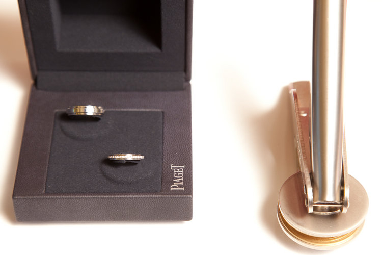 後來去看了P牌,很喜歡Possession系列的概念,又很喜歡戒指中間有一圈可以轉,好像賭神一樣(笑)。原本中間一圈鑚的那個款在我去年年底買的時候出了mini版─戒身更纖細,戴起來比較可愛。由於我先生也對同一系列的男裝戒頗有好感,所以我們很快的就作出決定了。沒想到,麻煩還在後面─我的手指太細了,連最小的size對我來說都有點大!門市小姐建議我向總公司訂做(不需另外收費),不過要等三個月以上,希望可以趕在我們四月香港婚禮前。幸好我的戒指在我的大日子前的兩個星期順利抵達香港,不然我就糗了。