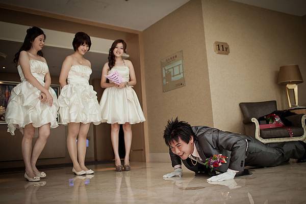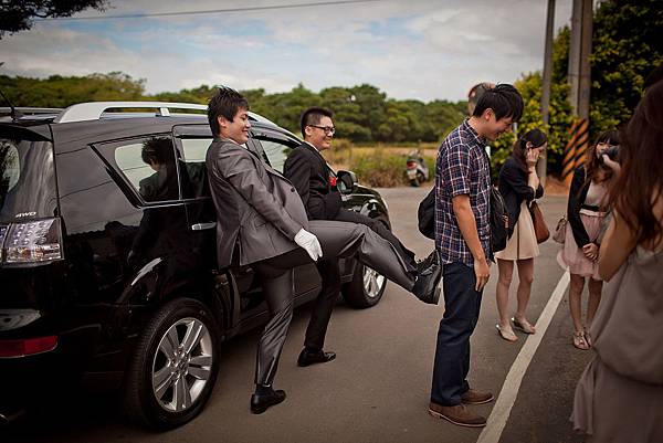 其中還有一張讓我老公非常讚許的照片,老公因為和當兵時的朋友有約,說三個人要在他結婚當天穿一樣的內褲出席,但是其中有一位弟兄食言(因為他將褲子放在老家),所以老公跟另一位弟兄當場就踢了該位弟兄的屁股,這一幕竟然被阿克拍下來了,連我老公自己當下都不知道呢,他看到照片的時候一直說:「竟然被拍到了!!!」