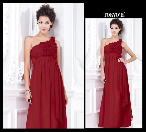 華麗玫瑰 斜肩雪紡波浪層次長禮服 紅色