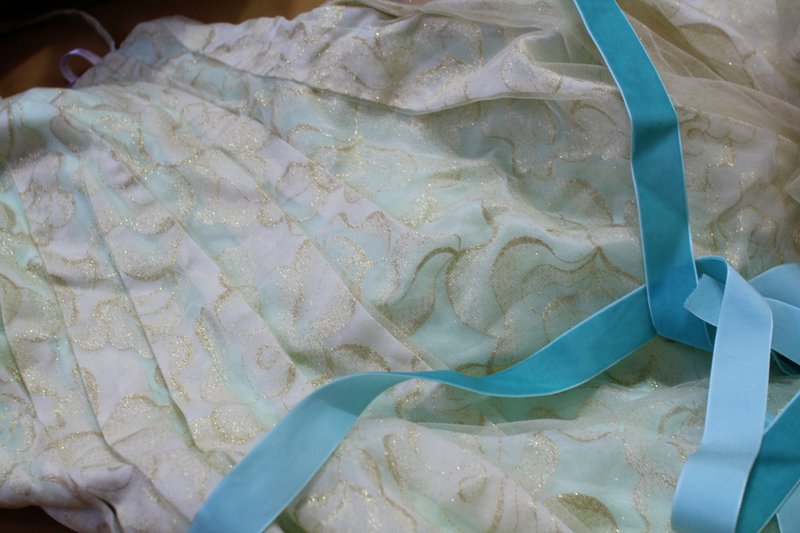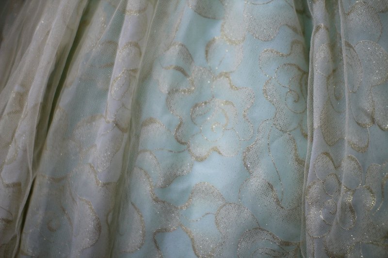 很特別的一件禮服,最外面一層是帶有點金蔥玫瑰花的紗布,裡面加一層綠色的緞布