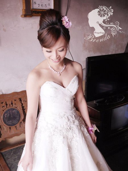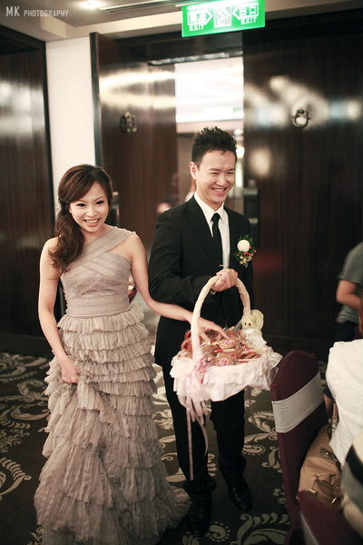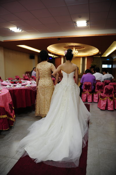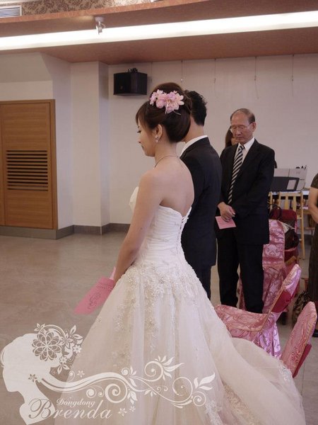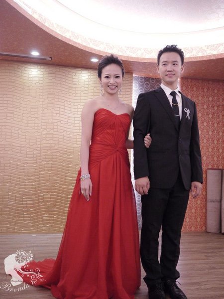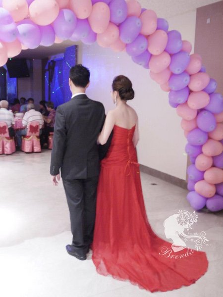 這一件款式真的很特別,顏色也是 絕對不撞色有一點藕紫色。大家都說這件禮服很好看,而且他是羽毛紗很輕。敬酒時很方便移動
