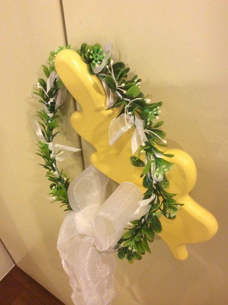 E鄉村風白綠優雅花環,短暫使用20分鐘,售100元。