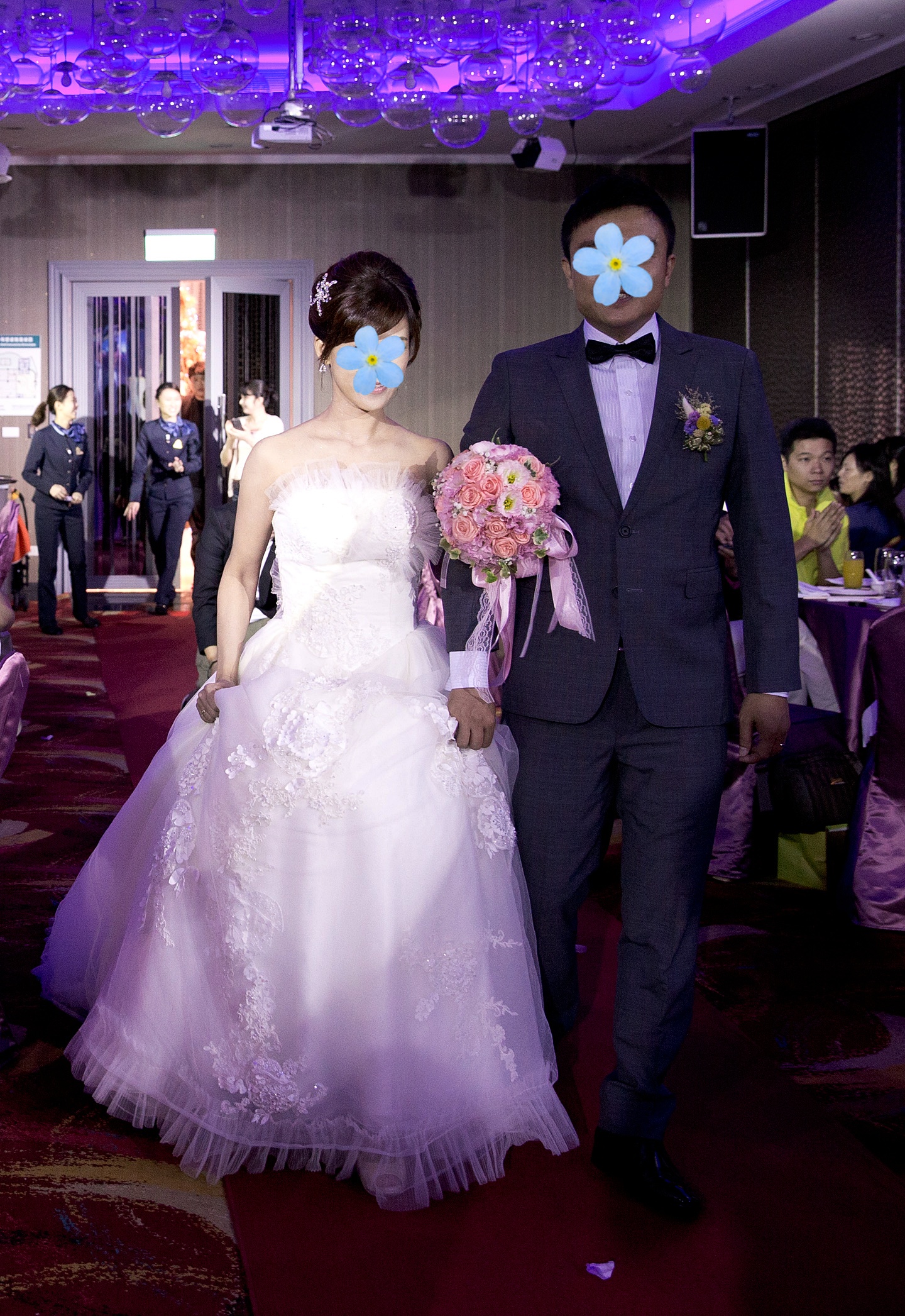進場正面照(這張比較能看出禮服的細節,裙子上有類似花朵的設計,上面還有水鑽)