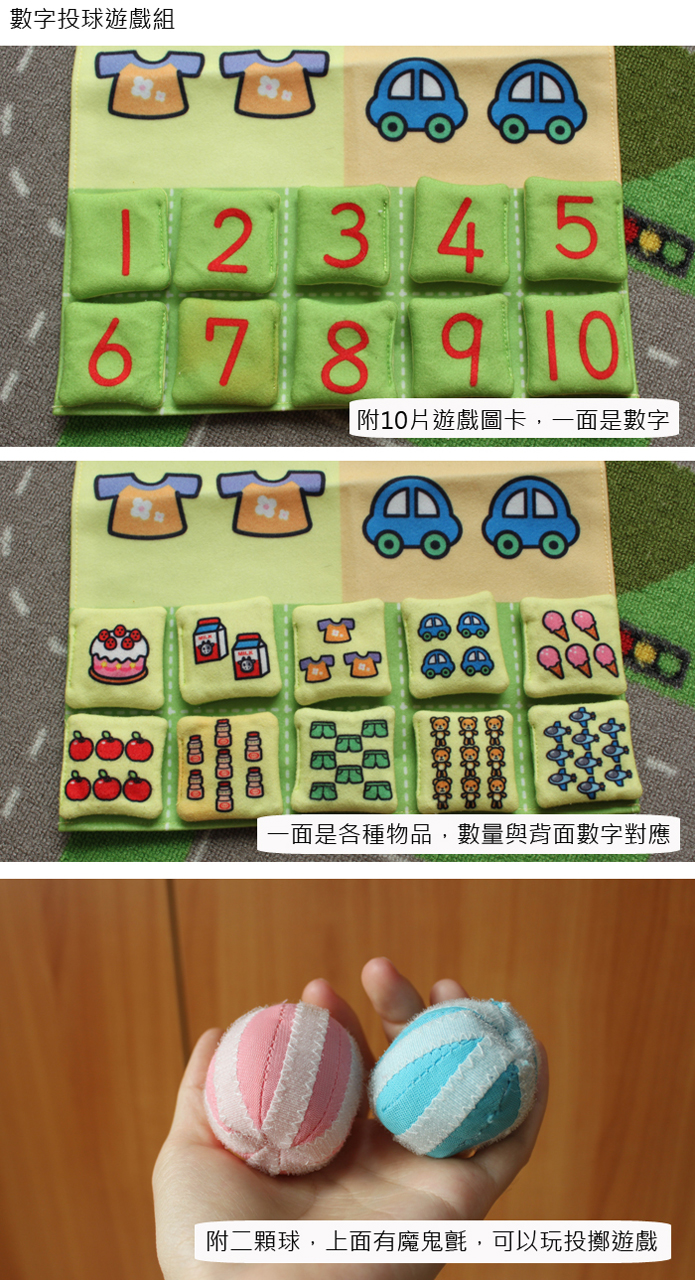 可以玩投球遊戲、認識數字、學習物品的數量與數字之間的關係、野餐遊戲等等,DVD中有詳細的玩法教學喔~~把拔馬麻也可跟寶貝一起發揮創意,創造出自己的玩法喔~~
