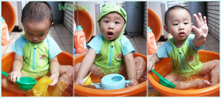 一開始先坐在椅子上玩,很好奇的玩著水淋下來的感覺,